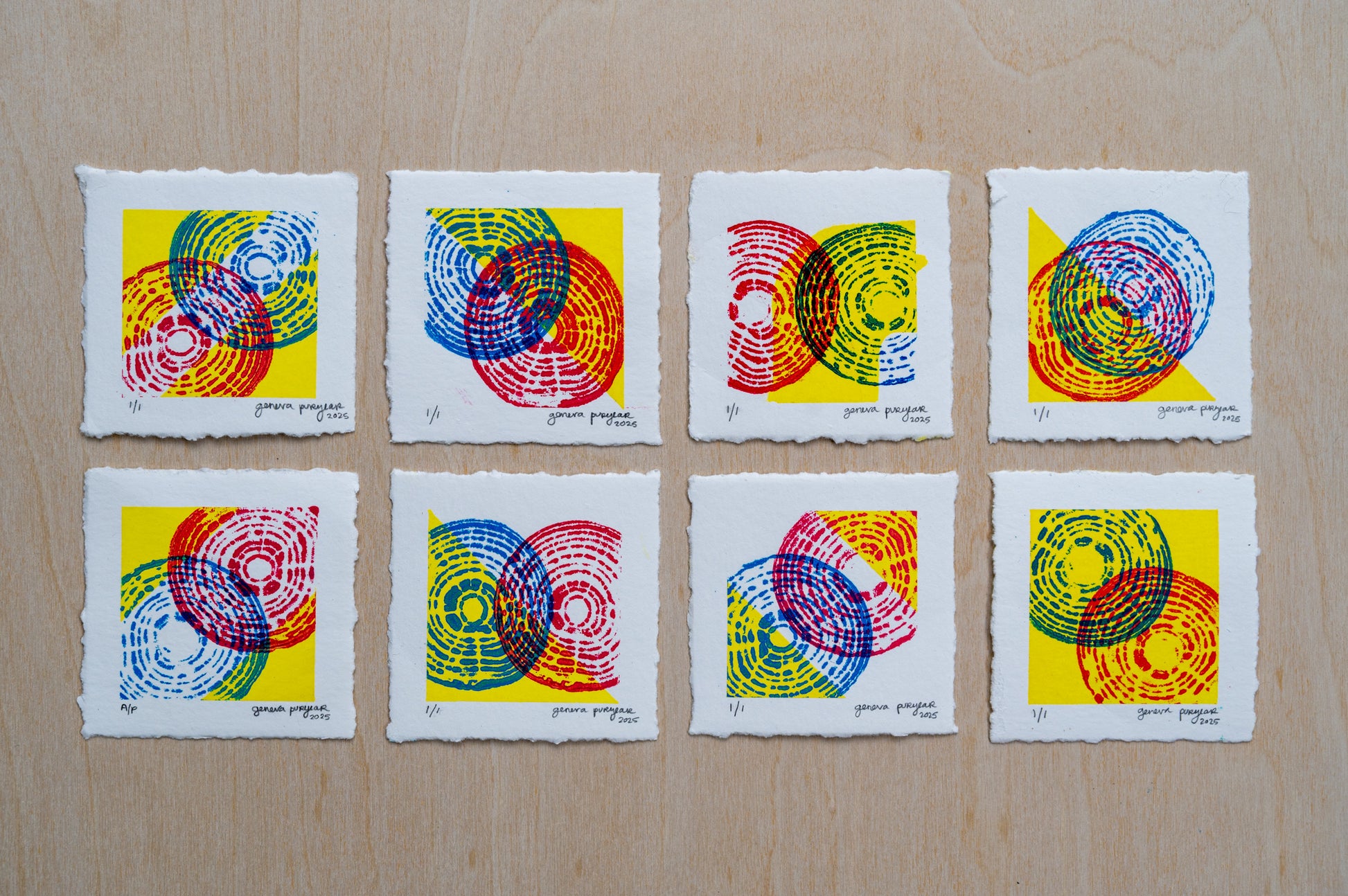 Printed using Primary Yellow, Cyan and Magenta Cranfield Safe Wash ink on white Bamboo archival printmaking paper