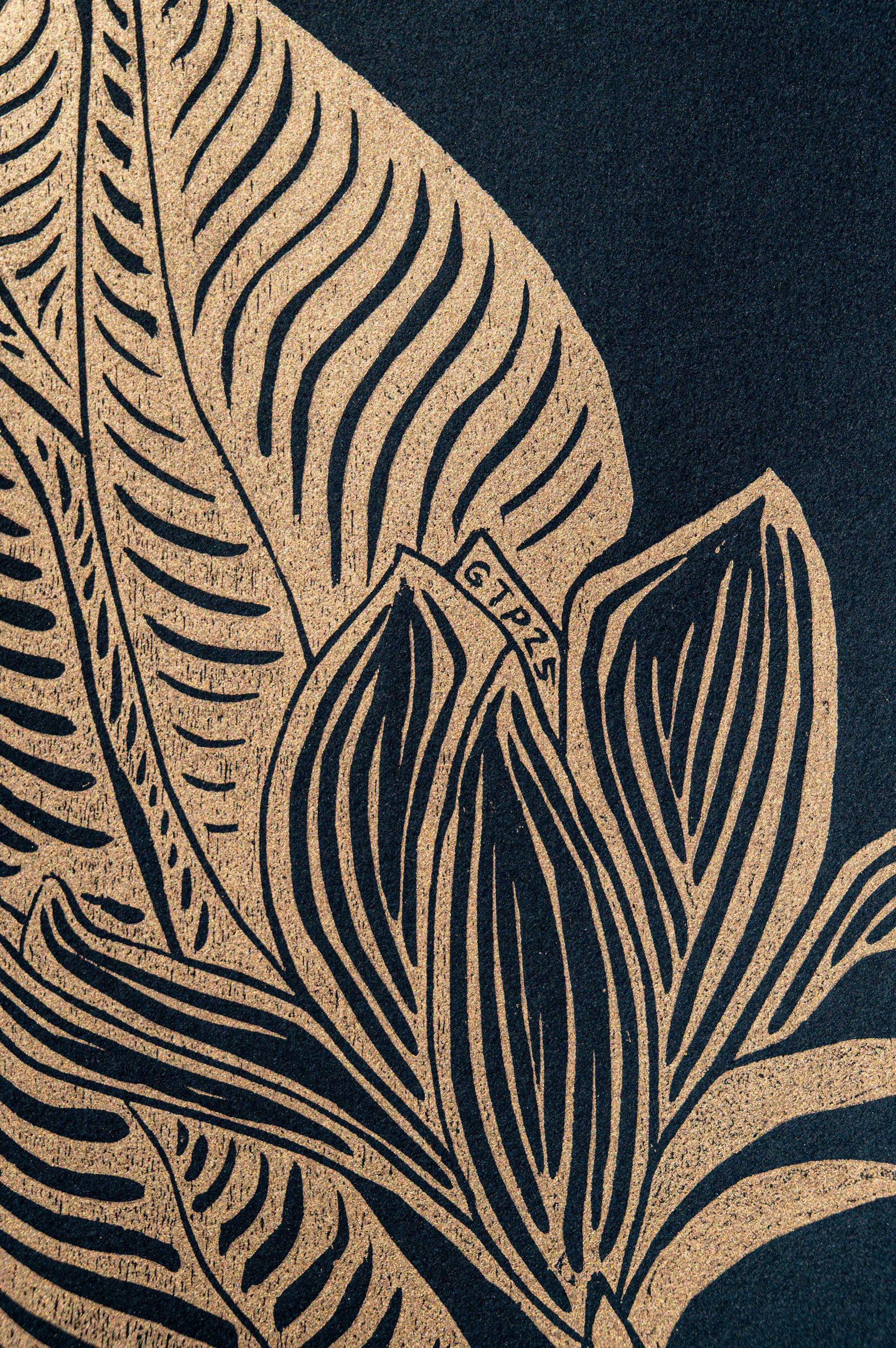 Printed using traditional Cranfield ink in gold metallic ink on black archival printmaking paper with deckled edges