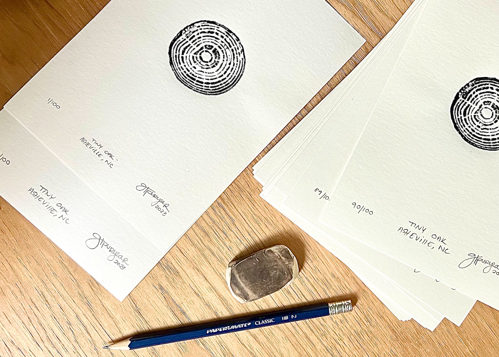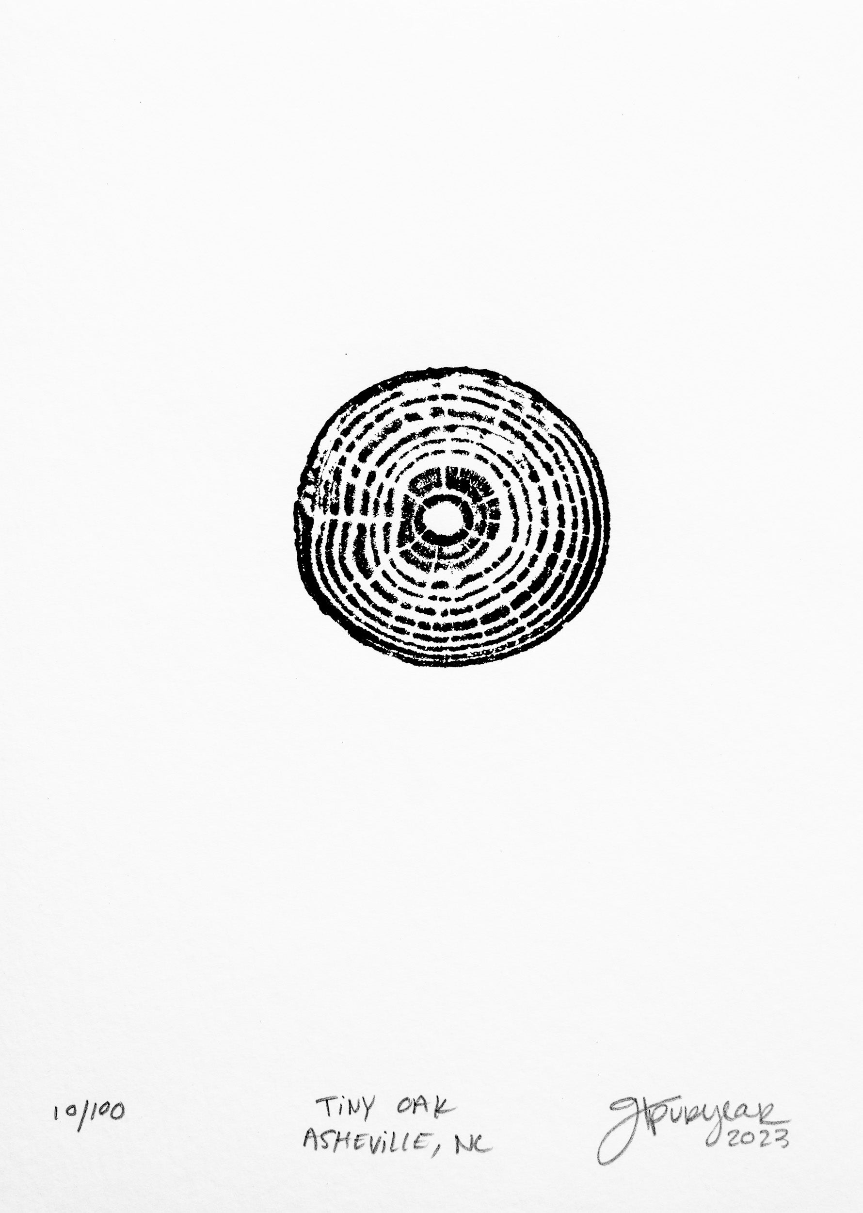 ‘Tiny Oak - Asheville, NC’ is a hand-pressed tree ring ink impression made from the end grain of a downed White Oak branch found in Asheville, NC. Each print in this edition is a hand-pulled ink rubbing printed on archival Bamboo paper using traditional block printing methods and are each considered original works of art, not digital reproductions. Due to the nature of printmaking by hand, slight variations or nuances may exist from one print to another. This is to be expected and demonstrates the true nature Printmaking and of an original handmade artwork.